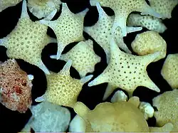 Star sand (Japanese: 星砂, romanized: hoshizuna, lit. 'star-sand'),[2] also known as living sand,[3] is a rare sand-like substance made up of the star-shaped skeletal remains of marine foraminifera in the family Calcirinidae.[4][5][6][7] When the Calcirinids die, their skeletons are swept from their reef habitats and accumulate by the billions on shore.[8] A Japanese myth holds that grains of star sand are the skeletons of descendants of the North Star and the Southern Cross, fallen to the waters of Okinawa and killed by a serpent sent by the god of the sea.[5] Star sand is found on shores throughout the west and south Pacific, including in the Indonesian archipelago, the Okinawa Islands, and Raine Island.[5][9][10] Development of star sand causes beaches to "grow" over time as a result of the forams' life cycle,[5] with annual rates of calcium carbonate production as high as 1 kg/m2 near coral reef margins in the Pacific.[3] Because of this, laboratory production of star sand for beach renourishment has been developed in Japan.[11][12] The Japanese government has cultured star sand at Okinotorishima to build the islet into a more stable atoll and thus to strengthen Japan's legal claim to the surrounding waters, which otherwise would belong to China.[13][14] Up to three quarters of the sediment mass of Tuvalu is star sand.[15] Bottles of star sand are sold as souvenirs.[9][3] Arenophiles acquire samples of star sand through trade with other enthusiasts.[16] Collection of large quantities of star sand for commercial purposes from the Great Barrier Reef is prohibited.[17] Since 1979, the erosion of individual grains of Baculogypsina sphaerulata star sand has been used as a metric of littoral drift in Japan, with scientists using the lengths of the skeletal spines to reconstruct the origins and travel distances of sediment deposits.[18][2] A similar process of measuring star sand spines was used in 2012 to study depositional processes on Raine Reef in the Great Barrier Reef.[19]