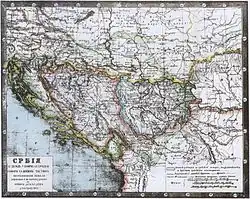 Serbian interest in the region of Macedonia was defined in a foreign policy program named Načertanije.[16] It was a document whose author Ilija Garašanin, a Serb politician envisioned a Serbian state that included the Principality of Serbia and territories such as Bosnia, Herzegovina, Montenegro and Old Serbia.[16] Garašanin in Načertanije was not clear about the southern confines of this larger state[16] and neither was Kosovo nor Old Serbia mentioned directly.[17] This program responded to the need to spread propaganda among Serbs within the Ottoman Empire.[16]