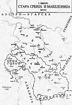 The majority of efforts to include Old Serbia into newer Serb discourses on Serbdom and the larger narrative about Serbia was undertaken by people outside the bounds of the Serb state, such as artists, composers, writers, scientists and other members of the intelligentsia.[31] A prominent example was Jovan Cvijić, a Serb academic who made ethnographic maps depicting the Balkans that aimed to advance Serb claims to Kosovo and his publications influenced later generations of historiographers.[31][10] Cvijić defined Old Serbia as including Kosovo and Metohija, spanning southward and encompassing Debar, Kumanovo, Prilep and Tetovo.[32][33] In 1906–1907, Cvijić wrote the Macedonian Slavs were an "amorphous" and "floating mass", and lacked national identity.[32][10] By regarding northern Macedonia as "Old Serbia", he sought to legitimize Serbia's territorial claims over the territory.[32] Cvijić continuously changed his maps to include or exclude "Macedonian Slavs", altering the location of the boundary between Bulgarians and Serbs and readjusting the colour scheme to show Macedonia as nearer to Serbia.[34]