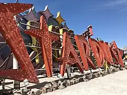 In 1977, the façade was revamped to remove the space theme and signage, instead adding a series of blue and magenta mirror panels along the front of the resort. The Stardust's roadside sign was retained,[304][305] although its lettering was eventually replaced with the Helvetica font in 1991. The original lettering was given to the city's Neon Museum,[305][288][306][307] and was eventually refurbished in 2020.[308] The Stardust roadside sign was dismantled in February 2007, and was also given to the Neon Museum.[305][202][309] A 56-foot-wide sign, for the property's Lido de Paris show, was also acquired by the museum and added to its tour in 2023.[310]