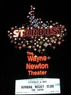 In October 1999, the Stardust hired Wayne Newton as its resident headliner for a reported $25 million per year. Newton would perform in the 920-seat Stardust Theater, which would be renamed the Wayne Newton Theater.[363][364][365][366] Enter the Night ended in December 1999,[367] and Newton began performing in the same theater space a month later.[368][369] Newton helped to keep the Stardust competitive during its final years.[177] Bob Anderson performed at the Stardust in 2000,[370] and began a three-month residency two years later, in the Starlight Lounge.[371][372] Gene Pitney made his Las Vegas Strip debut at the Stardust in 2003,[373][374] and hypnotist Anthony Cools began a six-month run at the resort that year.[375]