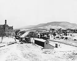 In 1875, College Township formed, taking up most of what is now State College.[14] In 1885, the Pennsylvania Railroad opened a train station two miles from campus in Lemont on the Lewisburg and Tyrone Railroad.[12] Passengers would have to catch an autobus or a hack to complete the journey to State College from the new station.[12] Construction of the train station on West College Avenue was finally completed in 1892, connecting State College to the Bellefonte Central Railroad via Struble. The journey along the 20-mile-long line took 50 minutes, meandering through the Scotia Barrens and the Buffalo Run Valley south of the Bald Eagle Ridge before making it to Bellefonte.[15] On August 29, 1896, State College would officially separate from College Township forming a borough.[16]
