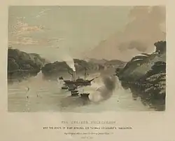 HEICS Phlegethon, HMS Spiteful and HMS Royalist then moved up to the river on 8 July where they were fired on from every position with slight damage.[54] Mahkota and the Sultan retreated upriver while most of the population fled upon their arrival at Brunei's capital, leaving the brother of the Sultan's son, Pengiran Muhammad, who was badly wounded and Pengiran Mumin, an opponent of the Sultan's son who despised the decision of his royal family to be involved in conflict with the British.[49][54] The British destroyed the town forts and invited the population to return with no harm to be done to them while the Sultan remained hiding in the jungle. Another expedition was sent to the interior but failed to find the Sultan. Brooke remained in Brunei with Captain Rodney Mundy and HMS Iris along with the Phlegethon and HMS Hazard while the main expedition continued their mission to suppress piracy in northern Borneo.[54]