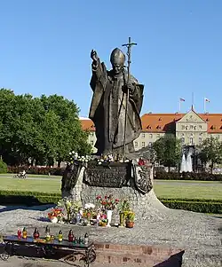 The statue of Pope John Paul II (Polish: Pomnik papieża Jana Pawła II) is a gunmetal statue in Szczecin, Poland, placed at the Bright Meadows Square, within the Downtown district. It depicts Pope John Paul II, commemorating his visit to the city in 1987. The monument was designed by Czesław Dźwigaj and Stanisław Latour, and unveiled on 18 June 1995.
