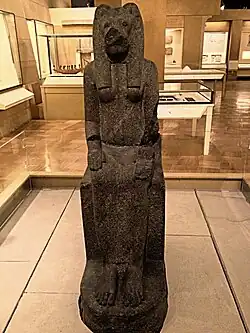 The Statue of Sekhmet /ˈsɛkˌmɛt/[1] currently housed in the Gallery of Ancient Egypt at the Royal Ontario Museum (ROM) is a life-sized sculpture of one of the oldest known Egyptian deities.[2] Her name is derived from the Egyptian word "sekhem" (which means "power" or "might") and is often translated as the "Powerful One".[3] Depicted as a woman with the head of a lioness – sometimes with the addition of a sun disc and the uraeus serpent atop her head – Sekhmet is the ancient Egyptian goddess of war who was believed to be a protector of Ma'at (balance or justice) and of the Egyptian people.[4] She was also associated with healing and medicine, and her priests were known for being trained doctors and surgeons of remarkable calibre.[3][5]
