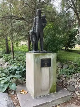 The statue of Thomas Anthony Dooley III with Lao children[1] is installed near the Grotto of Our Lady of Lourdes, Notre Dame.[2][3] The bronze sculpture measures approximately 4 ft. 3 in. x 2 ft. 2 in. x 1 ft. 6 in., and rests on a concrete base that measures approximately 4 ft. 6 in. x 5 ft. 1 in. x 4 ft. 6 in. A plaque reads: "THOMAS A. DOOLEY, M.D. '48 / 1927-1961 / Who as a pre-medical student / cherished Our Lady's Grotto / and who as a physician served the afflicted people of Southeast Asia / with uncommon devotion and dedication / Gift of the / Notre Dame Club of St. Louis / and the sculptor / Rudolph E. Torrini '59 / Dedicated February 1, 1986".[4]