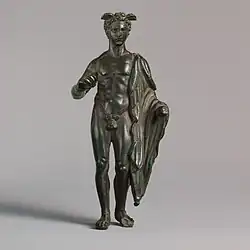 The Statuette of Mercury is a Roman bronze statuette of the god Hermes created in the 2nd century CE. Acquired by the Metropolitan Museum of Art in 2023, it is among a set of similar set of figurines acquired throughout the museum's history to be of either Gallic or Italic origin that likely served as a figure of worship in family household shrines.[ 1] [ 2]