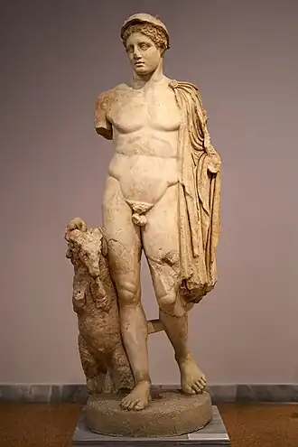 The Hermes Criophorus , based on the Greek original by Polykleitos The god is posed in a balanced and casual position, the contrapposto , indicative of many other statuettes manufactured at the time in the 2nd century.[ 7] They were modelled on the Greek originals like made by Polykleitos , such as that of the Hermes Criophorus , now at the National Archaeological Museum, Athens .[ 1] [ 5] [ 8]