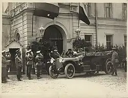 The closest associates of Grand Duke Nicholas in his role as the Supreme Commander were his chief of staff, General Yanushkevich, who was his closest confidant and controlled access to him; General Danilov, the head of operations; and the French military attaché, General de La Guiche (also spelled Laguiche), who was the liaison between the Grand Duke and General Joffre, his equivalent in the French Army. He was favored by Nicholas over the British representative, John Hanbury-Williams, and he also flew the French flag at the Stavka headquarters in addition to the Supreme Commander's standard.[7] During his time as Supreme Commander, he never visited the troops at the front line. There were different explanations for this given by those at the Stavka: that Yanushkevich advised him against it, who was worried about making the Emperor jealous of the Grand Duke's popularity among the troops, or the Grand Duke himself simply did not want to go. In any case, this led him to grant broad authority to his subordinate front and army commanders. Many of the orders he sent out were written as suggestions rather than as strict commands. However, he kept up to date on military operations and occasionally gave orders that went against what front commanders wanted. He was still actively engaged in commanding the army.[5]