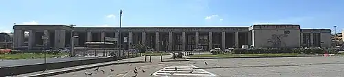 The square outside of the station was named Piazzale dei Partigiani after World War II.[2] Now, the square's primary function is a bus terminal and parking facility. Before 1990, however, the piazza was embellished with a well-maintained garden and a now-nonfunctioning fountain that was built in the 1950s as part of the design of the station's architect Roberto Narducci. The fountain was inexplicably excluded from the modernization and renovations for the 1990 World Cup, even though the square was part of the ambitious "Cento Piazze" beautification project.[6] The small palm gardens that surround the parking lot are today occupied by a number of homeless people, asylum seekers, and political refugees.[7] Every Monday and Friday, Red Cross volunteers use the square to distribute food to the city's homeless population, despite protests from the area's residents who say that the organization arbitrarily selected the site.[8]