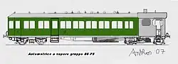 In 1904, two steam railcars were ordered from Purrey; classified as FS 80 these were withdrawn in 1913.[45] Sixty-five railcars, classified as FS 60, were purchased in 1905 to 1907, but found to be under-powered and sixteen were converted into locomotives.[53] At the 1906 Milan Fair an FS 85 (it) was exhibited and three were purchased by Kerr, Stuart and Company, followed by 12 also British built FS 86 (it).[54]
