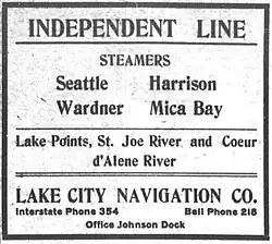 - ^ "Steamer Tacoma (Direct Service)". The Coeur d’Alene Press (advertisement). Vol. 3, no. 195. Coeur d’Alene, ID: Press Publishing Co. April 1, 1909. p.2, col.5.