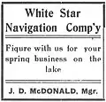 In the early 1900s, there was an intense rivalry on the lake and the rivers between two companies.[6] One concern was the Coeur d’Alene and St. Joe Transportation Company, later known as the Red Collar Line, which had been formed by Joseph Clarence "J.C." White and Jim Spaulding and his son, Harry.[6] The other company was White Star Navigation Co., also known as the White Star Line, which had been incorporated by Capt. George Reynolds and McDonald.[6]