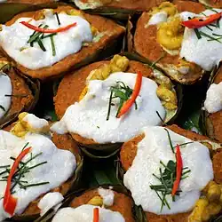 Northern Thai people of Lan Na also refer to the steamed curry dish as ho nueng (Thai: ห่อนึ่ง, ห่อหนึ้ง),[28] and the dish is also used as part of offerings to gods and spirits from the ancient period which is similar to the Canang sari.[29][note 1]