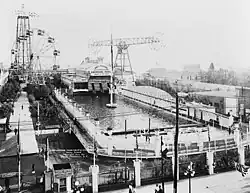 Steeplechase was created by George C. Tilyou (1862–1914).[2] On his honeymoon in 1893, he and his wife visited the World's Columbian Exposition in Chicago, where he saw the 250-foot-diameter (76 m) Ferris wheel and wanted to buy it. Since the wheel had already been sold, Tilyou built his own half-size version at Surf Avenue, on Coney Island, which soon became Coney Island's biggest attraction.[3][4][5] After noting that the nearby Sheepshead Bay, Gravesend and Brighton Beach horseracing tracks were very popular, Tilyou added other rides and attractions on the Coney Island peninsula. He came to own several rides, though none were part of a single park. In fact, until the opening of Paul Boyton's Sea Lion Park nearby in 1895, all of Coney Island's rides were separately operated.[6][7] As a result, Tilyou's concessions were originally overshadowed by the saloons on nearby Bowery Street.[5]