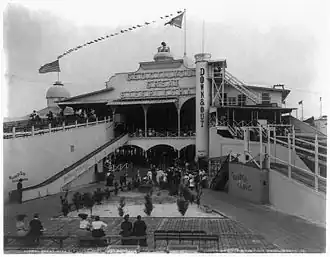 The park included over 50 attractions on its midway alone.[13] Attractions included novelties such as the Human Niagara, a Venetian gondola-style ride, the Aerial Racing Slide, the Double-Dip Chutes, the Bicycle Railway, a "French Voyage" panorama, and a Wild West sideshow.[14][15] Tilyou also operated a small steam railroad, a saltwater pool, a ballroom, and the Scenic Railroad coaster by LaMarcus Thompson.[3] Completing the park were scale models of world landmarks such as the Eiffel Tower and Big Ben.[16] Steeplechase Pier, a pier jutting into the ocean, was built to the south of the park in 1904.[17] Tilyou adopted a "Funny Face" mascot depicting a smiling man with several dozen teeth, nicknamed "the Tilly", as the icon for his park. The mascot, which became a symbol of Coney Island, represented the area's wholesomeness and neoclassical architecture combined with its veneer of hidden sexuality.[14][10][18][19] Tilyou's personal motto, "Keep 'em laughing", was symbolized by rides with such unconventional names as Whirlpool, Soup Bowl, Human Roulette, Human Pool Table, and Earthquake Staircase.[5]