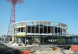 Tilyou stated that the park would be restored to a "grander than ever" condition, but in the meantime, he would erect temporary tent shows.[34] The remaining attractions opened one week after the fire.[15] Ultimately, the park was rebuilt with fireproof steel-and-concrete structures, as the municipality had passed a law restricting the construction of combustible wooden structures.[35][36] The park's reconstruction was funded by a $2 million stock measure issued by the Steeplechase Park Company, which Tilyou established in 1908.[37] Tilyou sold 100,000 shares in that company to the public and gave a season pass to everyone who bought a $5 stock certificate.[38] The park partially reopened in April 1908.[39][40] The New York Times described the construction as "scarcely finished" and that crowds "flocked" to the rebuilt attractions.[40]