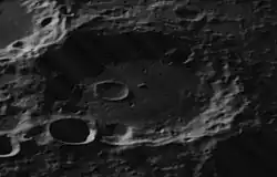 Stefan is a lunar impact crater on the far side of the Moon, just beyond the northwestern limb. Attached to the western rim is the slightly smaller crater Wegener, and close to the eastern rim is Rynin.