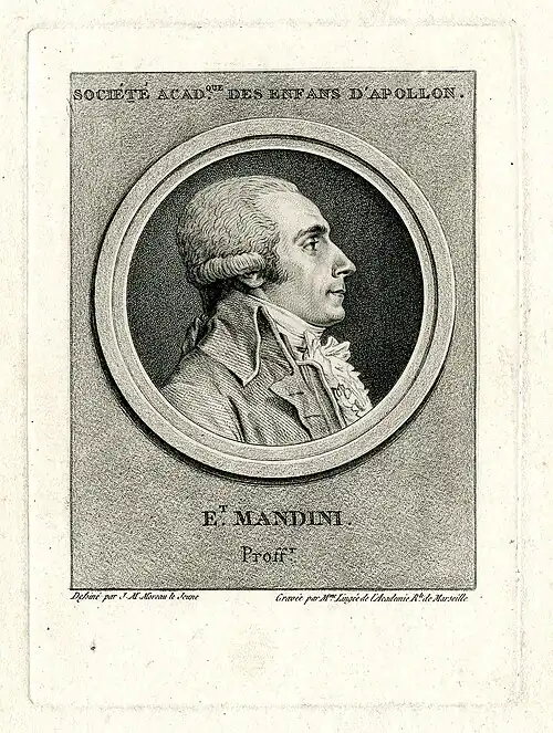 Keefe (2017), drawing on press comments of Mandini's time, infers he was capable of "splendid acting" and possessed "strong vocal technique".[7] The tenor Michael Kelly, who sang with Mandini in the Marriage of Figaro premiere, felt that his two baritone collaborators, Mandini and the celebrated Francesco Benucci (who sang Figaro) were "the two best comic singers in Europe".[8] When he journeyed to Saint Peterburg, his singing was admired by the painter Élisabeth Vigée Le Brun.[1]