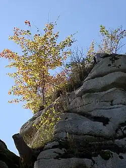 Like the Fichtel Mountains, the Steinwald consists mainly of granite. In the south and east it is surrounded by a basalt landscape of Kuppen - gentle, rounded summits - (Kemnather Land, Nördlicher Steinwald), whose most striking elevations are the Parkstein near Weiden, the Rauhe Kulm near Kemnath, the Schlossberg near Waldeck, the Armesberg, the Teichelberg and the Ruheberg. Numerous granite blocks and rock 'bastions' are found in the Steinwald, often with fantastic shapes. They have odd names such as Katzentrögel, Zipfeltannenfelsen oder Saubadfelsen.