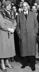 After the Marquess' death in 1935, she experienced a period of "shock and disorientation".[2] This was described in far more detail in the 1963 Observer profile. She immediately travelled to the United States. There she travelled by car across the country, staying in dollar-a-night lodgings and working as a dish-washer in order to understand "ordinary" Americans. This fact-finding mission was put to an end in somewhat unusual circumstances: "Her mission evidently caused some concern about her own well-being. In the end she was stopped on the road by a bewildered State Trooper who said: 'The President wants you to call him'."[1] She returned to Washington D.C. and would remain a close friend thereafter of Eleanor Roosevelt – the two shared an interest in alleviating poverty and wrote to each other fortnightly for years after her trip.[1][4]