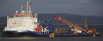 The vessel has a six-point mooring system (using her DP2 system). The vessel can also be beached, allowing her to do cable work onshore, she uses the Hi-plough, which is the latest in marine technology, allowing a deeper burial for the cable.