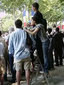 Step stools are halfway between a ladder and a stool, being used, as a support platform, for reaching targets that are at heights between approximately 2 and 3 metres (6.6 and 9.8 ft). The most common modern type is made with two separate ladders connected to each other at the upper end, where there is a platform with an area big enough to stand with both feet on it, having the rest of steps the same area, but not in all models, for some step stools have classical ladder steps. This folding design arrangement eliminates the need for a fixed support on a wall, as in the case of a standard ladder. They are widely used in the kitchen, to the point that in some places they are called "kitchen ladder".[1][2]