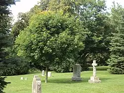 Leacock's grave (shaded) in the churchyard in Sibbald's Point
