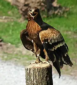 Predatory interactions with other carnivorous animals where the steppe eagles are victims are largely restricted to the vulnerable young, with the nest sites often being highly vulnerable due to their often accessible positions on mildly elevated ground. Hungry canids are often particularly detrimental predators, particularly grey wolves (Canis lupus) and dogs (often herding and feral ones) and more infrequently red foxes and other carnivores like cats and their kin.[101][204][205][206] An unexpected source of steppe eagle nestling mortality was found to be from the unusually aggressive pallid harrier (Circus macrourus) which attacked and killed two consecutive young eagles although never fed on them (possibly due to delayed displacement by the parent eagles).[207] Apart from the vulnerable young on the nesting ground, steppe eagles appear to be seldom killed by natural predators.[208] However, one was reported as the victim of a caracal (Caracal caracal) in Saudi Arabia (probably in a nighttime ambush).[209] More often, the steppe eagle is the predator rather than victim in deadly contests against other predators. Besides the many aforementioned accounts of prey including carnivores like mustelids and foxes, steppe eagles can also on occasion kill other raptorial birds and seems to consider even quite formidable species as viable prey.[208] In the Karaganda region alone, the local steppe eagles were recorded to prey on lesser kestrels (Falco naumanni), long-legged buzzards, Eurasian eagle-owls (Bubo bubo) and seven short-eared owls (Asio flammeus).[150] In the Altai region, in addition to eagle-owls, the black kite has also been recorded as steppe eagle prey.[10] In fact, the steppe eagle apparently is the only bird to have preyed upon Eurasian eagle-owls besides the golden eagle on multiple occasions.[150][10][210] Although rarely observed to halt movements or to eat while migrating in Israel, one steppe eagle was seen to suddenly strike down and consume an adult common buzzard while both species were in passage there.[47] A Brahminy kite that was seen attempting to mob a steppe eagle in Tamil Nadu was observed to be killed by the eagle, while at least one other Brahminy there was also injured by an aggressive steppe eagle.[211]