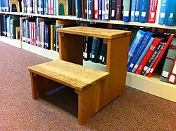 Step stools are halfway between a ladder and a stool, being used, as a support platform, for reaching targets that are at heights between approximately 2 and 3 metres (6.6 and 9.8 ft). The most common modern type is made with two separate ladders connected to each other at the upper end, where there is a platform with an area big enough to stand with both feet on it, having the rest of steps the same area, but not in all models, for some step stools have classical ladder steps. This folding design arrangement eliminates the need for a fixed support on a wall, as in the case of a standard ladder. They are widely used in the kitchen, to the point that in some places they are called "kitchen ladder".[1][2]