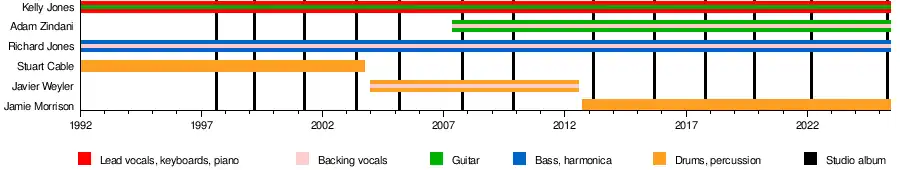 Everett went on holiday for two weeks but Jones and Cable wanted to continue rehearsing, so Jones invited long-time friend Richard Jones to fill in for Everett.[15] Stunned by Richard's appearance and bass playing, Cable convinced Kelly to keep him instead of Everett.[15] The band decided they needed another member to play lead guitar. Simon Collier was the first guitarist brought in. He did not stay in the band, but instead became Kelly's guitar technician.[16] The band tried hiring two other guitarists, another Richard Jones and Glenn Hyde.[17] Neither stayed for long. Hyde did, however, play harmonica on "Rooftop" for the band's 2001 album Just Enough Education to Perform.[17] After Hyde left, the band stuck as a three-piece act.[17]