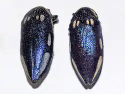 Sternocera orissa can reach a length of about 35–45 millimetres (1.4–1.8 in). The basic color of the elytra is greenish-black or bluish-black, with whitish to yellowish eyespots and markings.[3]