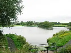 Stevenston Stone was a high quality white sandstone, marble-like, quarried from about 1800 and popular in places such as Dublin and Belfast. The site was allowed to flood in 1920; it was 150 to 200 ft (50 to 60 m) deep, connected to old mine workings which provided a steady and substantial water flow[17] which has to be pumped out continuously to prevent flooding. Ballast and other material from the old Caledonian Railway embankment nearby was used to infill much of the old quarry.