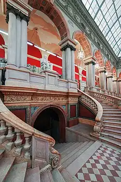 The museum's first director, Maximilian Messmacher, based his design upon a similar museum in Vienna. Constructed between 1885 and 1896, the building is an example of the Neo-Renaissance at its most stylistically forceful. The ground floor with arched windows is heavily rusticated and the upper storey is turgid with ornate details and statuary. The central hall is set between two-storey Italianate arcades, while interiors of other halls are styled so as to conform with items exhibited therein. A room patterned after the Terem Palace particularly stands out as "an opulent knockout", in the words of Tom Masters of the Lonely Planet.