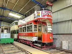 Some of the trams were sold after they were withdrawn from service, and tram number 5, one of the original batch of ten vehicles supplied by Dick, Kerr & Company in 1901, which was withdrawn in 1948, was one such vehicle. The lower saloon was in use as a hen house, when it was discovered in 1971. It was recovered from a field between Glossop and Hayfield by 236 Squadron Royal Corps of Transport, and restoration by the Stockport 5 Tramway Trust began. They obtained a 4-wheeled truck from the Porto Tramways Company in Portugal, and reconstructed the end balconies and the upper deck. Once restoration was completed in 1996, it went to Blackpool Tramway, where it was used intermittently. It visited Doncaster in 2002, as part of their celebrations of 100 years of public transport, was used intensively in Blackpool in 2003, and then was used infrequently.[10]