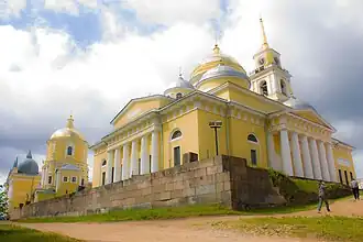 The island is the home of Nilov Monastery, which was founded by Saint Nilus in 1594, and previously welcomed up to 40,000 pilgrims each year. Most of the buildings of the monastery were built in the 18th and 19th centuries in a neoclassical style. Today the monastery complex remains one of the most impressive ensembles of Neoclassical architecture in Eastern Europe. Some of its churches date back to the 17th century. A graceful embankment was completed by 1812, and a large cathedral built in 1821-25. The construction of the causeway to the island was completed in 1812. The Nilov Monastery was one of the largest and wealthiest monasteries in the Russian Empire. Since the 1980s, many Russian Orthodox Christians commemorate the Feast of the Epiphany on January 19th by submerging themselves in the freezing waters, including those surrounding the monastery and the island.[1][2]