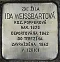 HERE LIVED IDA WEISSBARTOVÁ NÉE POPPEROVÁ BORN 1876 DEPORTED 1942 TO THERESIENSTADT MURDERED 1942 IN IZBICA | Josefa Uhra 231 49°24′23″N 16°24′43″E / 49.40652709999999°N 16.412056500000062°E | Ida Weissbartová née Popperová was born on 6 February 1876 in Lomnice u Tišnova. She was the mother of Markéta Liebesná and the grandmother of Jan Líbezný (1923-2003) and Lilly Luisa Liebesná (1927-1944). In 1940 she moved to her daughter, her son-in-law and her grandchildren. On 29 March 1942, she was deported from Brno to Theresienstadt concentration camp by transport Ae. Her transport number was 321 of 1,000. On 27 April 1942, she was deported to Izbica ghetto near Lublin by transport Aq. Her transport number was 762 of 999. There she was murdered in the same year.[12] Also her daughter, her son-in-law and her granddaughter died. |