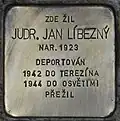 HERE LIVED DR. JUR. JAN LÍBEZNÝ BORN 1923 DEPORTED 1942 TO THERESIENSTADT 1944 TO AUSCHWITZ SURVIVED | Josefa Uhra 231 49°24′23″N 16°24′43″E / 49.40652709999999°N 16.412056500000062°E | Jan Líbezný (originally Liebesný) was born on 6 December 1923 as the son of Otto Liebesný and Markéta Liebesná in Lomnice u Tišnova. He had a younger sister, Lilly Luisa (born 1927). After visiting the municipal school in Tišnov, he worked in various professions. In 1942, he was deported to Theresienstadt concentration camp by the Nazi regime. In 1944, he was deported to Auschwitz concentration camp, and thereafter during the same year to Schwarzheide, an outpost of Sachsenhausen concentration camp. In April 1945 Jan Líbezný was transferred to Sachsenhausen and then liberated. As the only member of his family, he could survive the Nazi regime and the Shoah. After his return to Czechoslovakia in 1945 he had his name czechised.[7] He met Zdenka Blahoňovská, married her in 1947 and moved to Tišnov. Together they had two daughters. In 1951, the family moved to Trutnov. Jan Líbezný studied law and became a lawyer. He died on 27 June 2006 in Trutnov, where he was also buried. | |