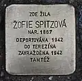 HERE LIVED ŽOFIE SPITZOVÁ BORN 1867 DEPORTED 1942 TO THERESIENSTADT MURDERED 1942 IBIDEM | Brněnská 1710 49°20′55″N 16°25′20″E / 49.348576°N 16.422189°E | Žofie Spitzová was born on 9 November 1867. She was arrested and, on 4 April 1942, deported from Brno to Theresienstadt concentration camp by transport Ah. Her transport number was 266. One week later, on 11 April 1942, Žofie Spitzová lost her life in Theresienstadt.[27] The death certificate mentions Marasmus senilis as the cause of death.[28] | |