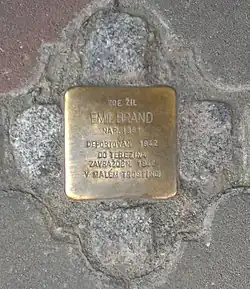| HERE LIVED EMIL BRAND BORN 1881 DEPORTED 1942 TO THERESIENSTADT MURDERED 1942 IN MALY TROSTENETS | Vodní 56/11 49°17′55″N 17°23′43″E / 49.2986111°N 17.39527777777778°E | Emil Brand was born on 28 February 1881. His last residence before deportation was in Kroměříž, where he owned the Café Kavarna Brandova. After his brother-in-law Edward Kohn died in the First World War, he took care of his sister Elsa and her daughter Klara. On 30 June 1942, he was deported from Olomouc to Theresienstadt concentration camp by transport AAg (his number on this transport was 234). Elsa, Klara and her spouse were also deported to Theresienstadt a few days earlier. On 14 July 1942, Emil Brand was transferred to Maly Trostenets extermination camp with the transport AAx (his number on this transport was the 610). The transport included 1,000 people, 998 of them were murdered by the Nazi regime. One of the victims was Emil Brand. His niece Klara survived as the only one of the family and returned to Kroměříž. She married again, the family then moved to Canada and finally to the US, where she died in 2000.[4] |