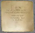 | HERE LIVED JONATHAN ASTEL BORN 18.06.1931 DEPORTED 30.6.1942 TO THERESIENSTADT MURDERED 1944 IN AUSCHWITZ | Moravcova 259 49°17′54″N 17°23′49″E / 49.2983331°N 17.3970350°E | Jonathan Astel |