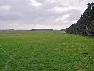 The Stonehenge Cursus (sometimes known as the Greater Cursus) is a large Neolithic cursus monument on Salisbury plain, near to Stonehenge in Wiltshire, England. It is roughly 3 kilometres (1.9 mi) long and between 100 metres (330 ft) and 150 metres (490 ft) wide. Excavations in 2007 dated the construction of the earthwork to between 3630 and 3375 BCE,[3] several hundred years before the earliest phase of Stonehenge in 3000 BC. The cursus, along with adjacent barrows and the nearby 'Lesser Cursus' are part of the National Trust's Stonehenge Landscape property, and is within the Stonehenge and Avebury World Heritage Site.