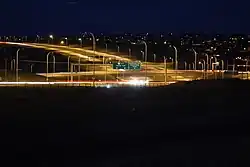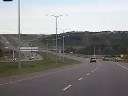 At Sarcee Trail a signalized intersection was initially constructed, but upgraded to an interchange when the project was completed. The segment from Country Hills Boulevard to Sarcee Trail was opened on November 25, 2008, a year ahead of the full extension to Deerfoot Trail.[12] An interchange at Country Hills Boulevard was added to the northwest ring road project in January 2005 to replace the original signalized intersection built when this segment of the ring road was built in the 1990s.[6] The original project scope had this remaining as a signalized intersection. The interchange opened to traffic in September 2008.