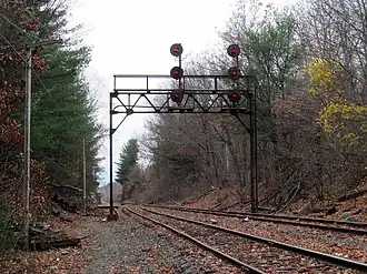 The B&M installed block signals on the Stony Brook around 1914, as a means of improving the line's capacity. This proved insufficient on its own, so in 1917 the B&M followed up by installing double track on the first few miles of each end of the line, both between West Chelmsford and North Chelmsford, and between Willows and Ayer Junction.[3] A decade later, continued heavy traffic led to the installation of both double track and centralized traffic control (CTC), the latter believed to be the first such installation in New England. These improvements began in 1927 and were completed the following year. A wye was constructed in 1930 at North Chelmsford, which allowed trains traveling to or from Nashua, New Hampshire, to use the line without having to make a reverse movement.[3]