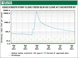 The United States Geological Survey (USGS) maintains stream gauges along Stony Clove Creek. The station in Chichester in operation since 1997, 1.8 miles (2.9 km) upstream from the Esopus, had a maximum discharge of 14,300 cubic feet (400 m3) per second on August 28, 2011, as Hurricane Irene passed through the area. It had a minimum discharge of 3.1 cubic feet (0.088 m3) per second on October 3, 2014.[4] A former station in operation from February 1997 to August 2007, 1.3 miles (2.1 km) upstream from the Esopus, had a maximum discharge of 13,000 cubic feet (370 m3) per second on April 2, 2005, and a minimum discharge of 3.7 cubic feet (0.10 m3) per second from September 20–22, 2002.[5]