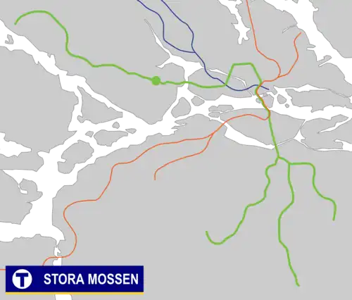 Stora Mossen metro station is a station on the Green line of the Stockholm metro. It is located on the border between the districts of Ulvsunda and Stora mossen, which are part of the borough of Bromma in the west of the city of Stockholm. The station is on an embankment and has a single island platform, with access from a pedestrian subway under the line linking Drottningholmsvägen and Stora Mossens Backe.[2][3] The distance to Slussen is 9 km (5.6 mi).