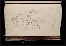 The painting that resulted from this sketch is called "Winchelsea, Sussex, Soldiers on the March c.1828" and depicts a column of soldiers marching up Strand Hill with a group of camp followers seated in the foreground. Soldiers had been stationed in Winchelsea during the Napoleonic Wars to help guard the coast and along the Royal Military Canal which runs along the marshes below the town. The area was also a haunt of smugglers and coastguards often called on the soldiers for support in dealing with them. Turner would have seen the soldiers garrisoned in Winchelsea when he passed through the town in 1816 on his sketching tour.[9]