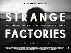 Strange Factories is a 2013 British experimental horror film written, directed by John Harrigan and produced by the British immersive theatre and production collective FoolishPeople. The film is an example of interactive cinema, featuring a mixture of film and live performance.[1] It centers on a writer, who travels through a mysterious landscape filled with cultists, hallucinatory visions, and a mysterious factory that emanates a strange humming sound.
