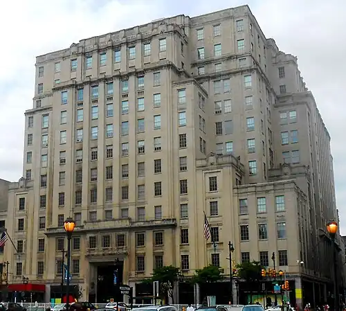 In 1928, the company decided to replace all but one of its buildings with a new edifice, and began construction in phases on the 13-story building which stands on the corner of Market and North 8th Street today. Designed in the Beaux Arts-style by the Philadelphia architectural firm Simon & Simon, the cost of the limestone building was expected to be $6.5 million, an amount which caused some concern to the store's owners.[4] By the time of the ribbon-cutting in 1931 in the depth of the Great Depression, the staggering $10 million cost (equivalent to $207 million in 2024) of such grand construction nearly suffocated the cash-strapped company.[4]