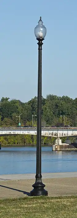 In December 1922,[41] the CFA undertook an initiative to both improve the street lighting in certain areas of the District of Columbia as well as design an aesthetically pleasing and uniform lamppost.[42] Twelve designs were drafted by Captain John E. Wood, an engineer with the Army Corps of Engineers and a commissioner on the three-man Commission Government of the District of Columbia, and W.B. Hadley, a D.C. government electrical engineer.[38] Designs ranged from a "Millet post" with a taller base to a huge 20-foot (6.1 m) double-globe post designed to light plazas and traffic circles.[41] Captain Wood presented a final revised lamppost design to the CFA on November 15, 1923. The post was designed by Wood with input from PEPCO officials. Because commissioners felt that adequate illumination could only be delivered by two lights, the post had a cross-arm at the top. The post simple in its design, contained room for electrical wires and equipment in its hollow shaft and base, and was easily cleaned.[43] The two-arm model was initially rejected by the CFA, however, because the arms appeared "stuck on" and not integral to the design. There were also issues with servicing and cleaning the lights in the two-arm model. A one-globe lamppost was approved instead.[44] The approved single-globe model came in both 15-foot (4.6 m) and 18-foot (5.5 m) models, and could deliver 981 candela.[45]